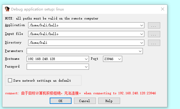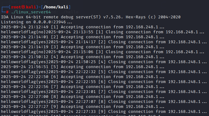 1.先将IDA安装目录下linux_server64拷贝到远程执行程序目录下,然后进行动态调试,注意接口默认的。