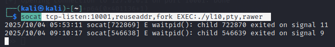 socat tcp-listen:10001,reuseaddr,fork EXEC:./yl10,pty,rawer