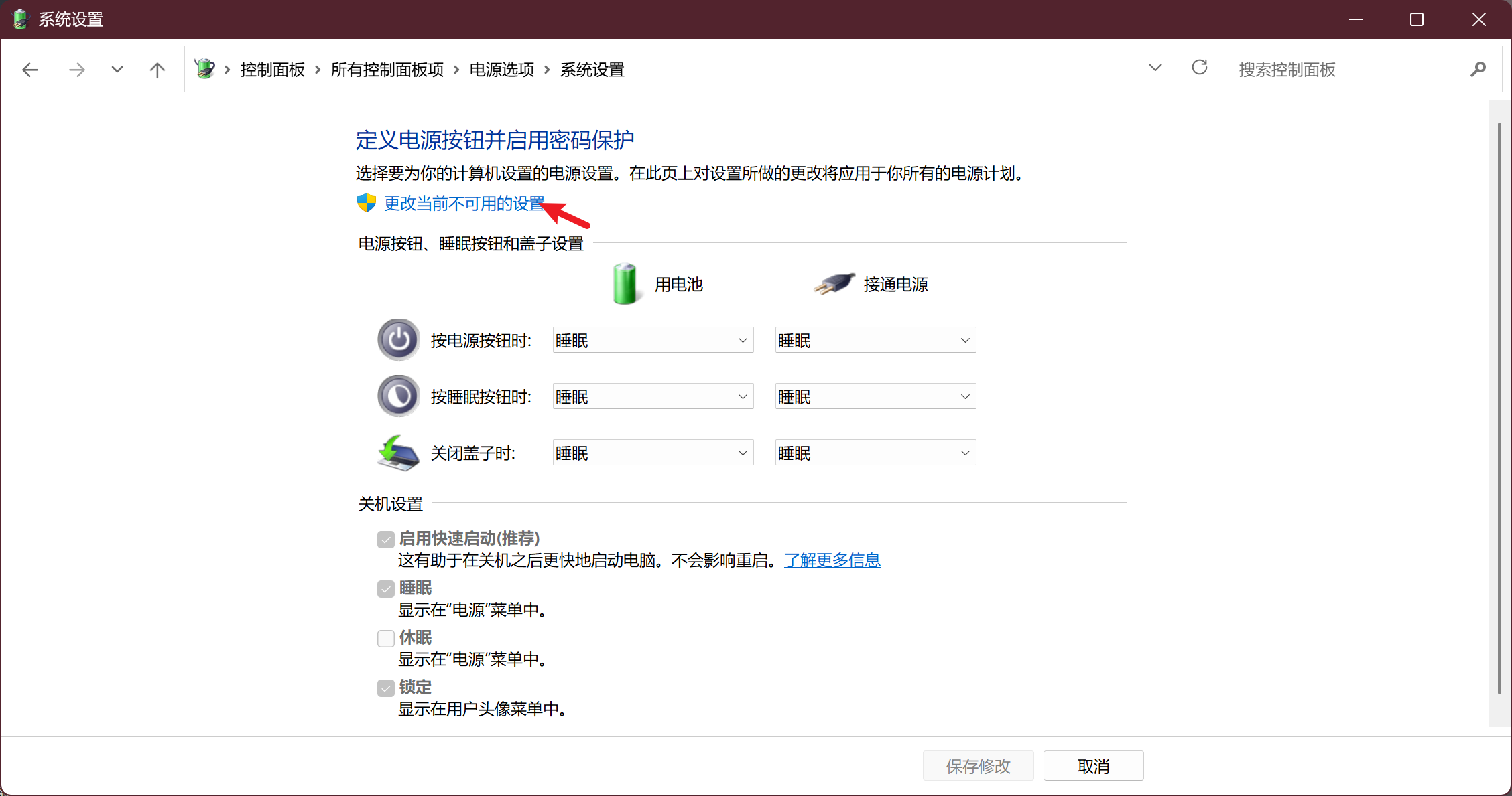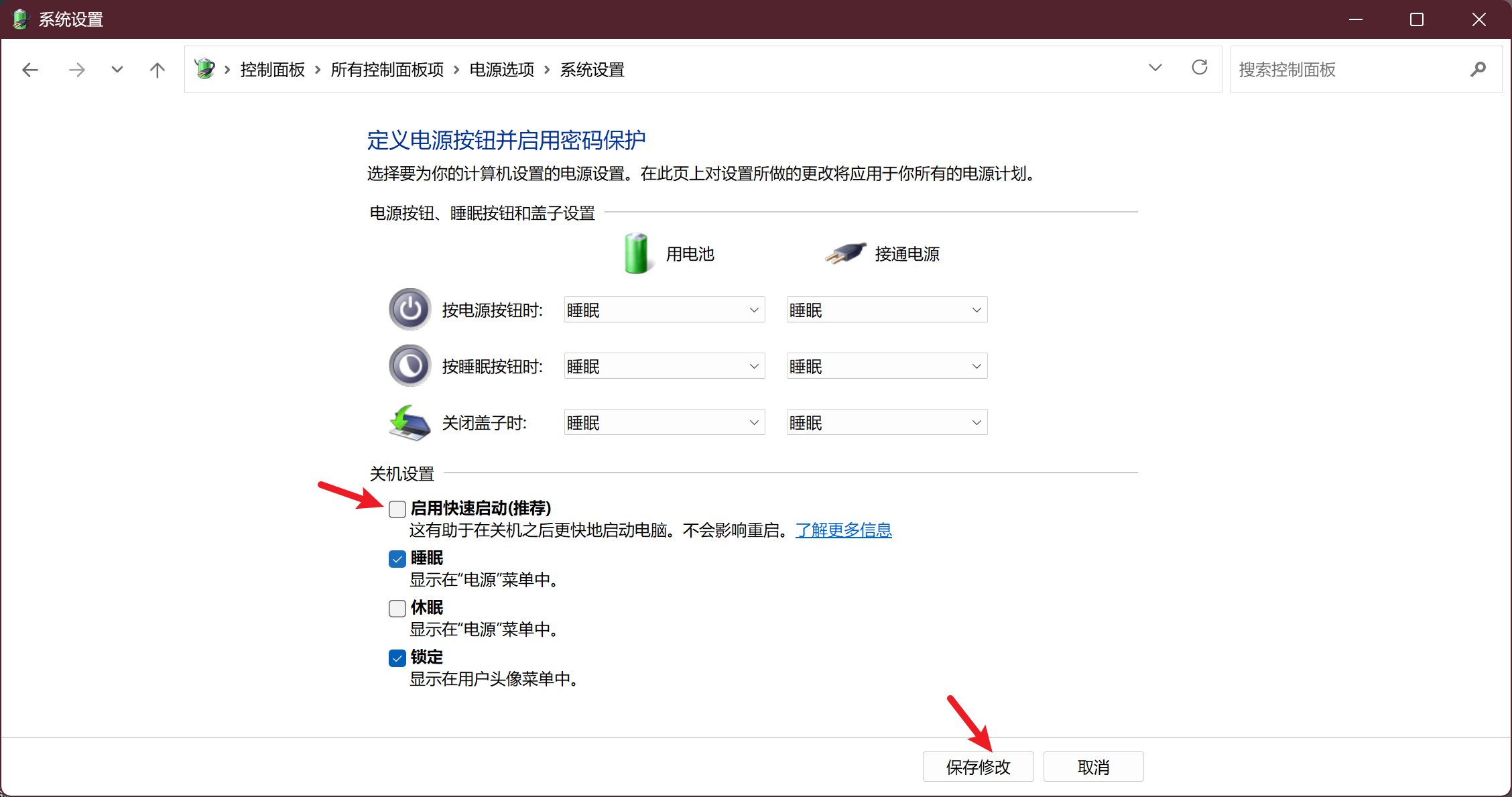 第四步:关闭启用快速启动选项,保存修改,关机,重新启动。