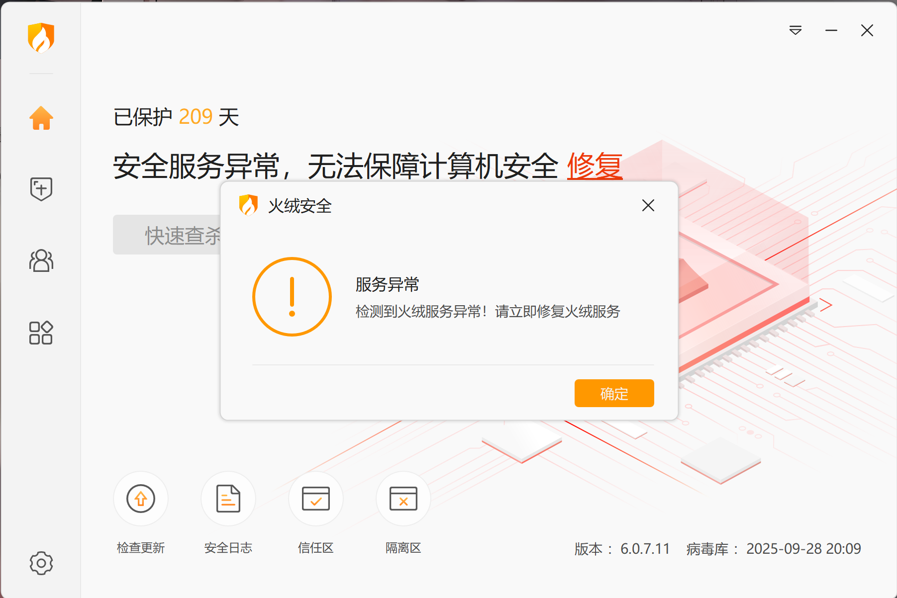 服务异常:检测到火绒服务异常!请立即修复火绒服务