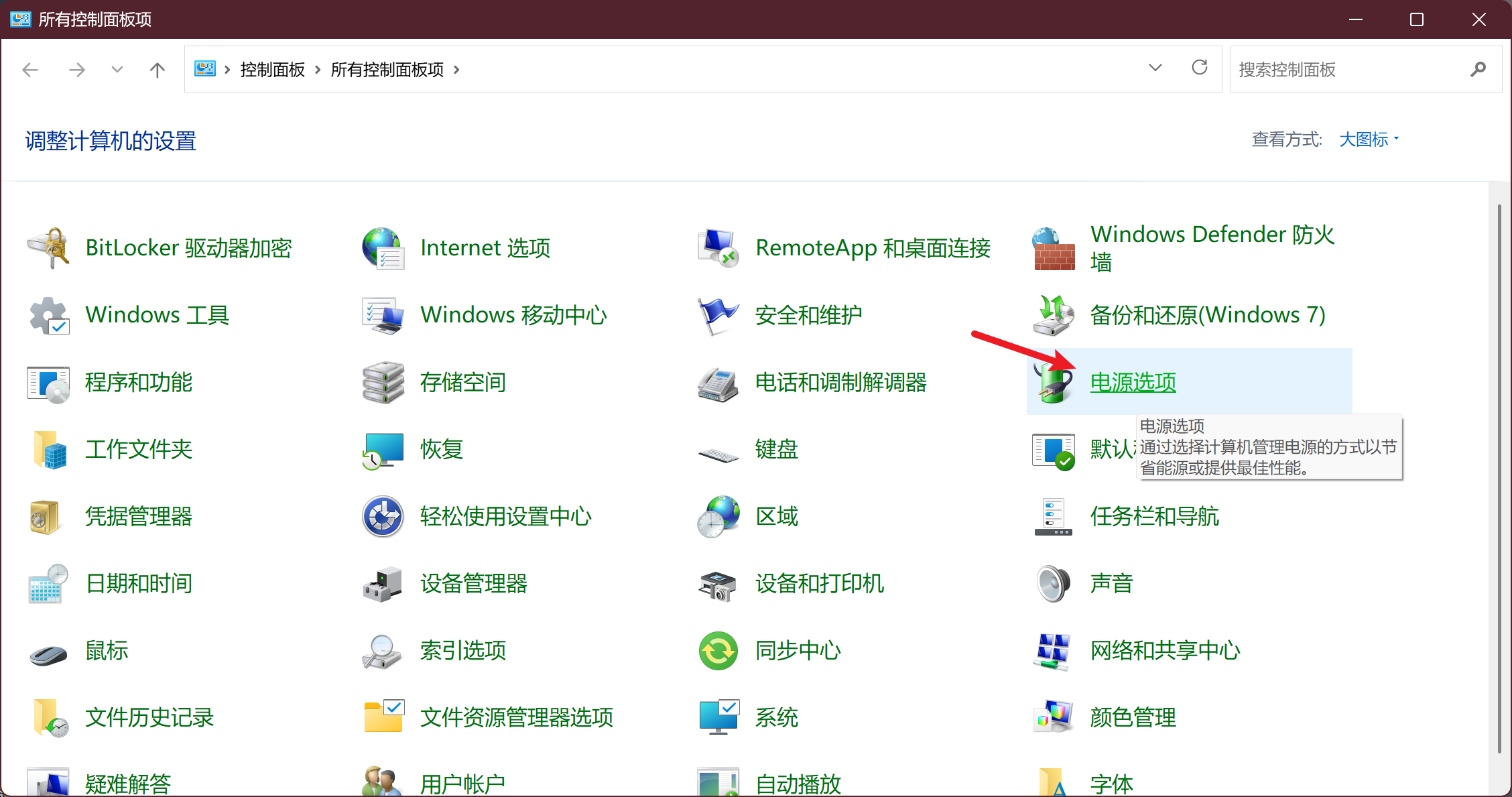 找到电源或电源选项,视系统情况而定(查看方式:大图标),选择电源按钮选项,选择电源按钮的功能。