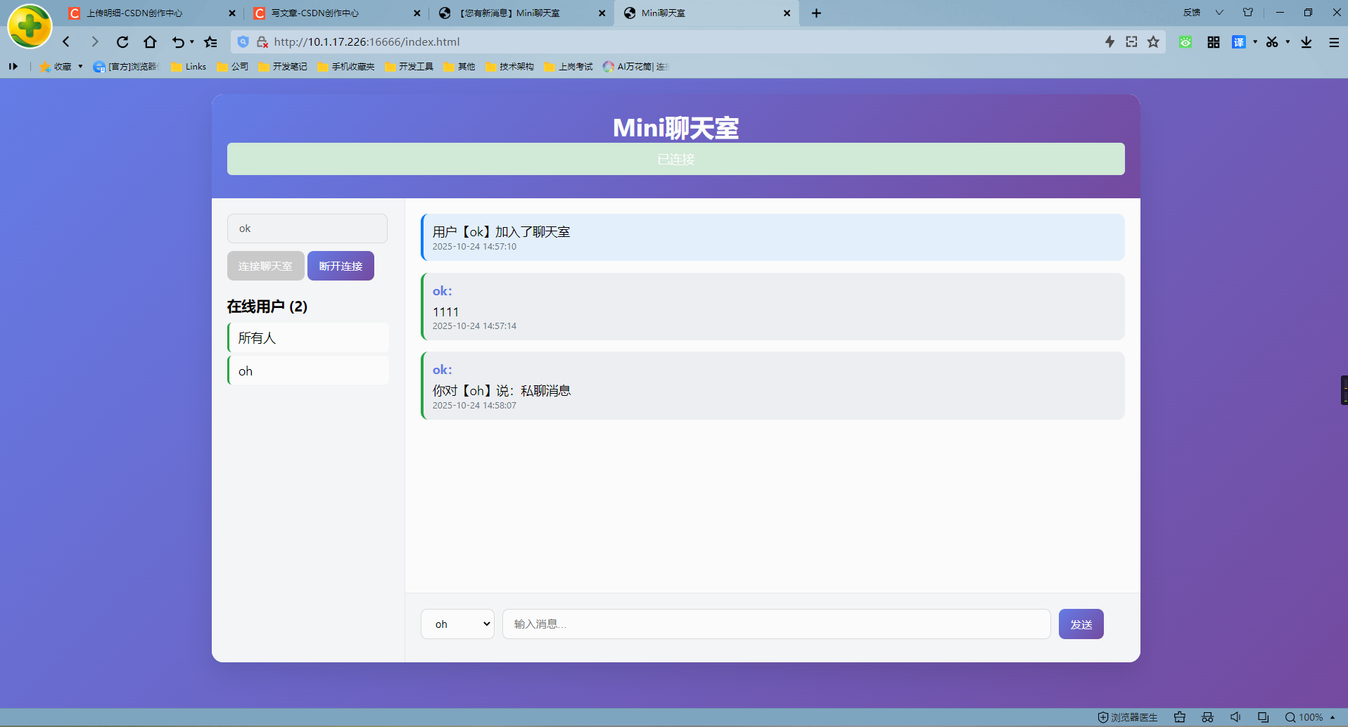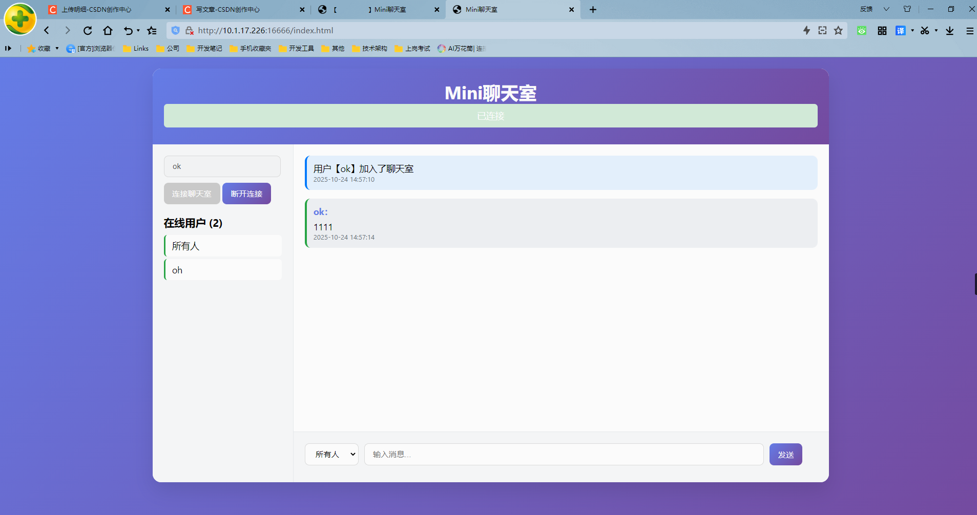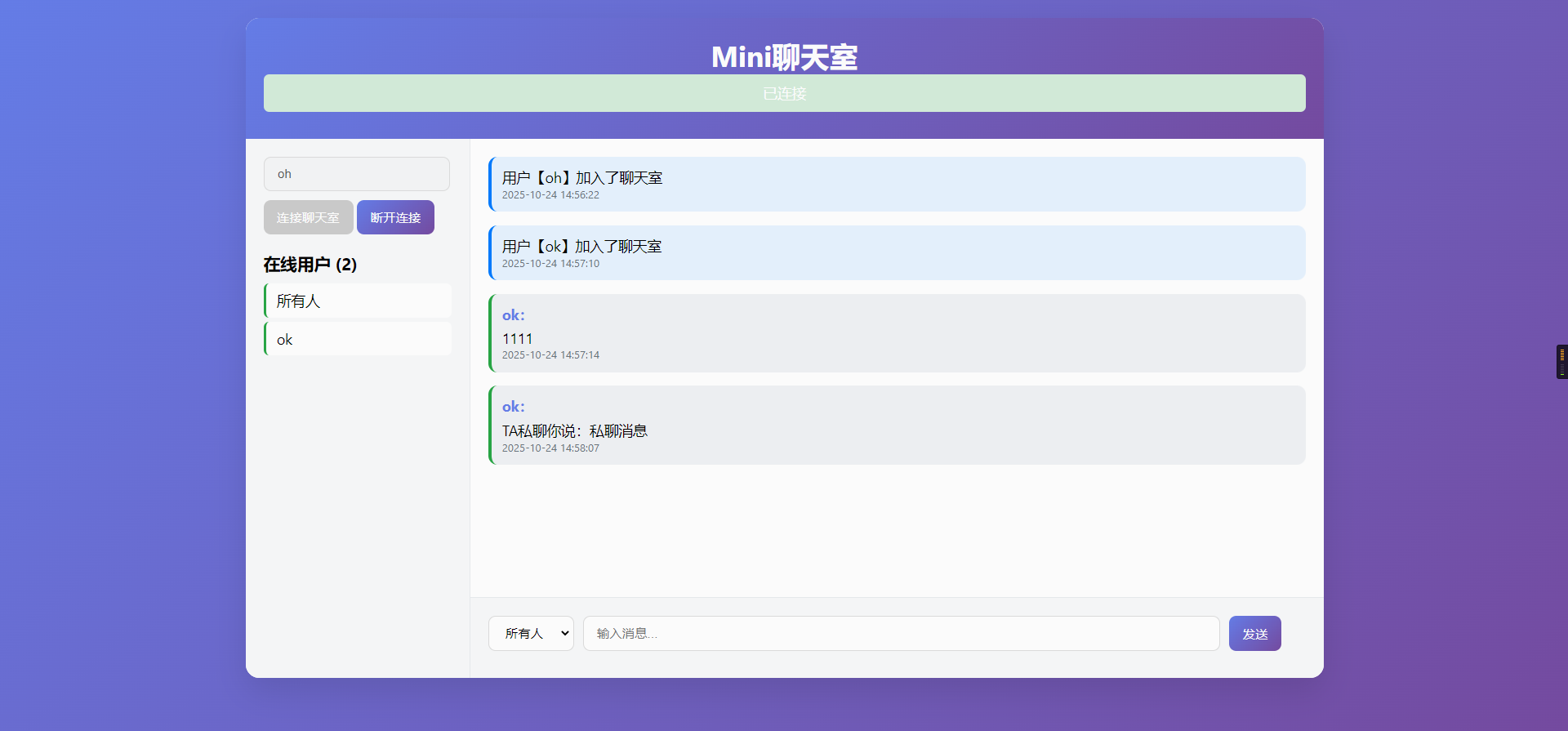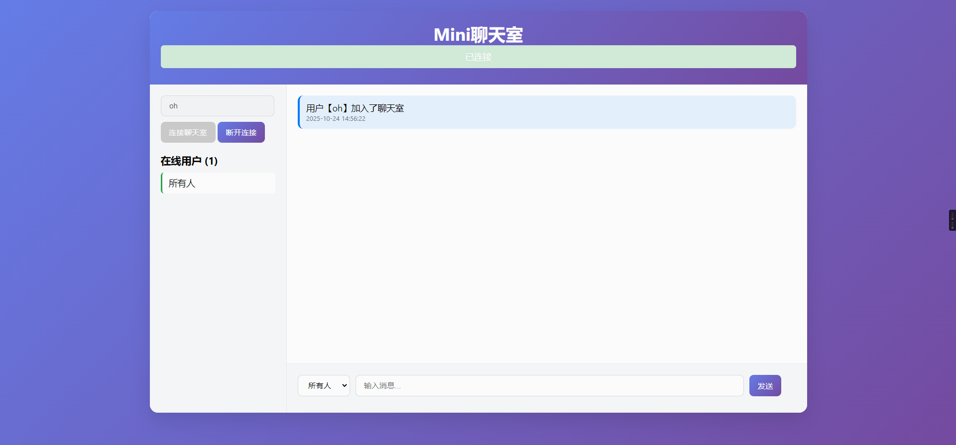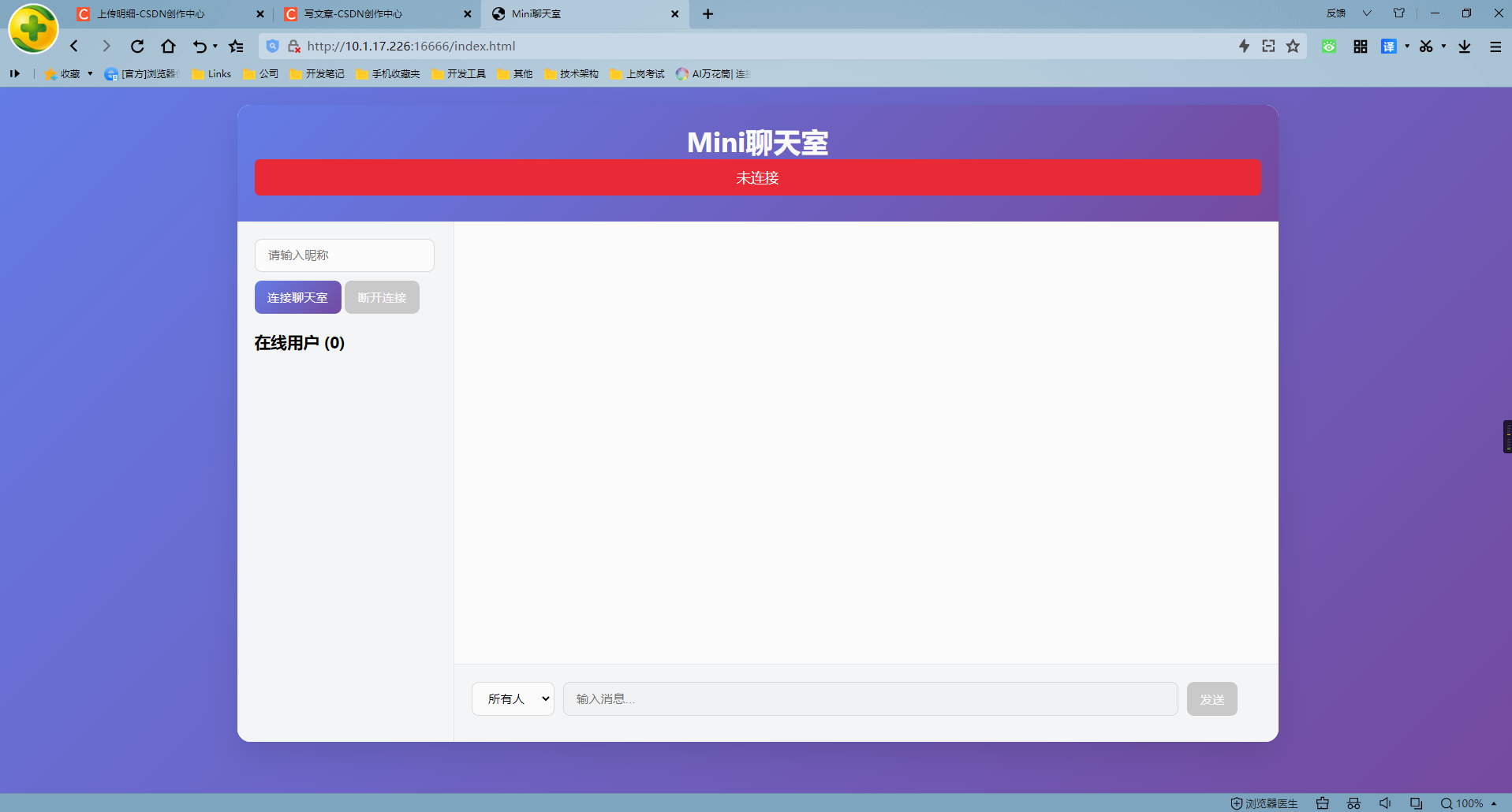 通过输入昵称加入聊天室,并通过群发通知所有在线用户的上线下线消息。