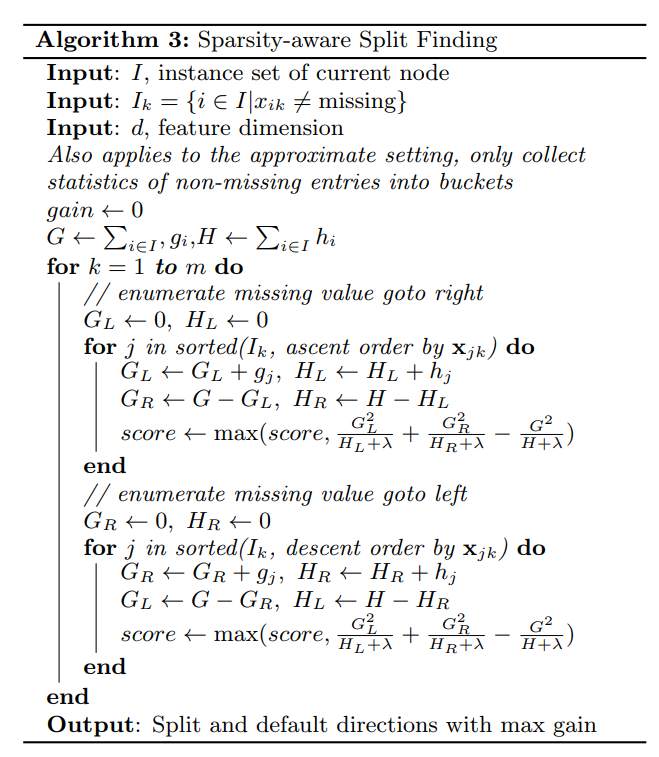 上图,为缺失值处理的方式,在某个特征下,部分样本没有特征的取值(但样本都是有gi和hi的),这是就把缺失值样本都放左边或者都放右边,比较Gain的大小