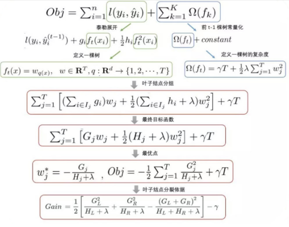 xgboost还在GBDT的损失函数上,加了正则化项,将损失函数近似为二阶泰勒展开,将目标函数(损失函数+正则化项)基于样本形式的求和,转换为基于叶子节点预测值的求和形式(下图第一行变为第四行),求得损失函数的极值。这里每个样本gi和hi是已知的