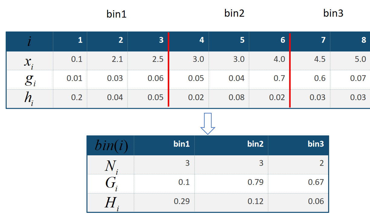 3、当遍历一次数据后,直方图累积了需要的统计量(同一个bin里面gi、hi求和),然后根据直方图的离散值,遍历寻找最优的分割点
