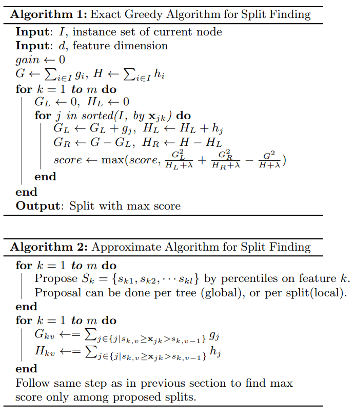 上图,算法1就是精确贪心算法,求每个树节点,每个特征下每个特征取值的划分,求Gain最大的那个划分点。但是,如果样本的特征维度过高、特征取值数量过多,展开效率还是很低。因此,在特征维度和特征取值这两方面进行筛选或取值的压缩,以减少计算量。