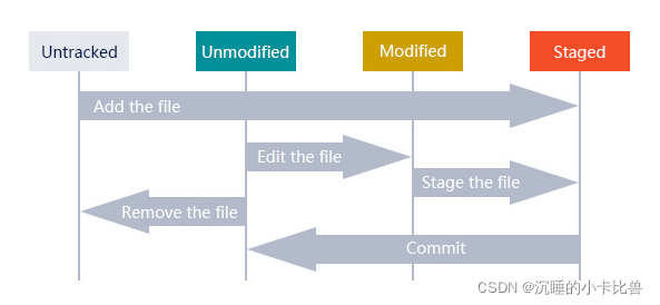 - Staged:执行git commit 则将修改同步到库中,这时库中的文件和本地文件虽为一致,文件为Unmodified。执行git reset HEAD filename取消暂存,文件状态为modified。