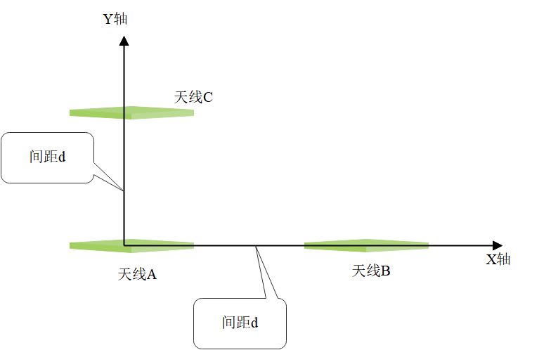 要想测量得到卫星信号的入射的方位角和俯仰角,需要2个以上的天线阵列。这里我们以最简单的3天线阵列为例说明。三天线阵列的排列方式如下: