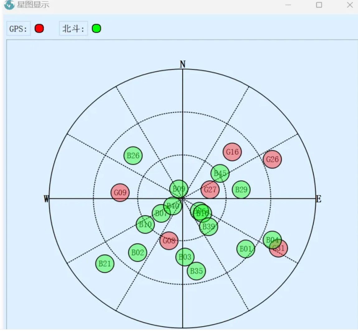 下图是GNSS(北斗、GPS)接收机的定位精度计算中给出的GPS卫星和北斗卫星的星图。从图上我们可以看到,GPS卫星、北斗卫星分布在接收机视场内的不同方向(不同的方位角和俯仰角)。