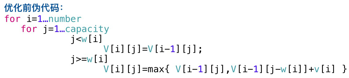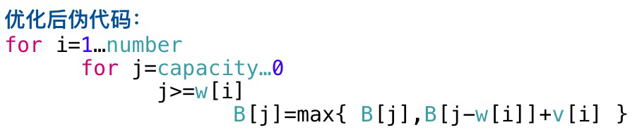 因此,可以将V缩减成一维数组,从而达到优化空间的目的,状态转移方程转换为 B(j)= max{B(j), B(j-w(i))+v(i)};