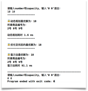 5) 蛮力法效率低不建议采取,但可以用于检验小规模的动态规划解背包问题的正确性和可行性,如下图输出可见,解01背包问题用动态规划是可行的: