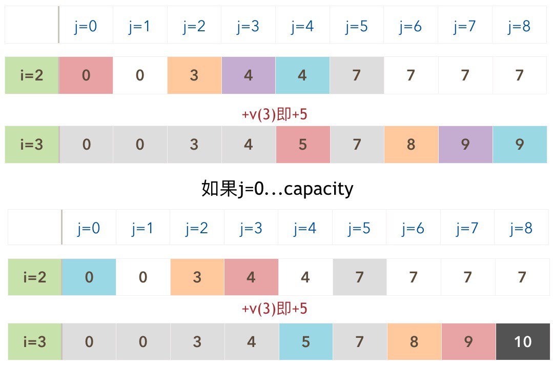 如果j不逆序而采用正序j=0...capacity,如上图所示,当j=8时应该有B(8)=B(8-w(3))+v(3)=B(4)+5,然而此时的B(4)已经在j=4的时候被修改过了,原来的B(4)=4,现在B(4)=5,所以计算得出B(8)=5+5=10,显然这于正确答案不符合;所以该一维数组后面的值需要前面的值进行运算再改动,如果正序便利,则前面的值将有可能被修改掉从而造成后面数据的错误;相反如果逆序遍历,先修改后面的数据再修改前面的数据,此种情况就不会出错了;