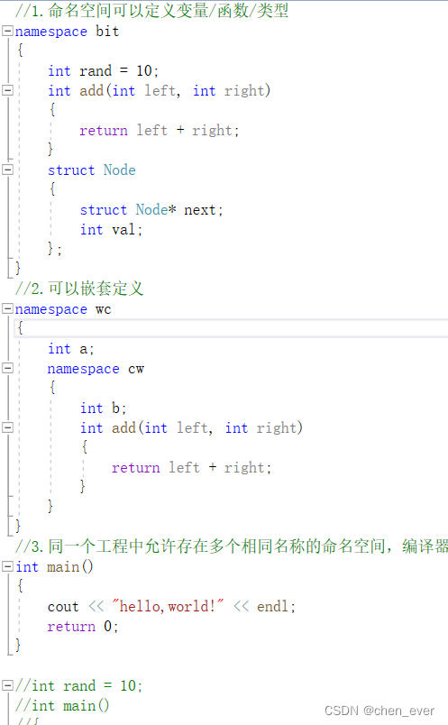 在C/C++中,变量、函数和后面要学到的类都是大量存在的,这些变量、函数和类的名称将都存在于全局作用域中,可能会导致很多冲突。使用命名空间的目的是对标识符的名称进行本地化,以避免命名冲突或名字 污染,namespace关键字的出现就是针对这种问题的