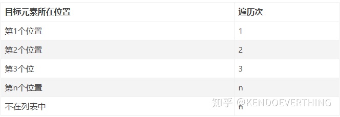 下面简单分析下:目标元素如果在列表中,出现的位置有n种情况,加上不在列表中这一种情况,总共n+1种情况。每种情况下需要遍历的次数如下表: