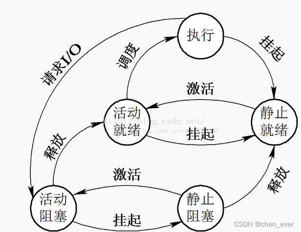 挂起状态:在执行状态的进程通过挂起即可进入就绪状态,如图所示,就绪状态和阻塞状态都分为活动态和静止态。由活动态向静止态转换就是通过挂起实现的。