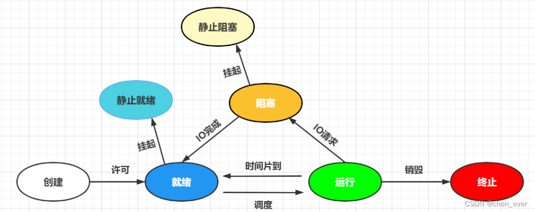 操作系统创建进程时,进程处于创建态,CPU调度进程时,进程处于运行态,此时其它已创建的和时间片到的进程就处于就绪态,当然还有些进程在进行磁盘、网络等IO时就处于阻塞态,操作系统销毁进程时,进程就处于终止态。另外,进程还具有静止就绪态和静止阻塞态,处于这两种状态,说明这个进程被操作系统挂起了,操作系统挂起进程,是为了观察和分析进程。