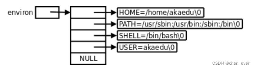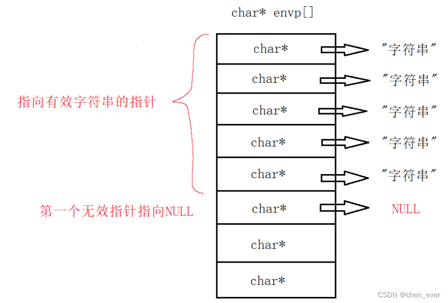 其中 char* envp[] 是一个指针数组,该数组里面的指针都分别指向不同的字符串,并且最后一个指向有效字符串的指针的下一个指针一定指向 "NULL" 。