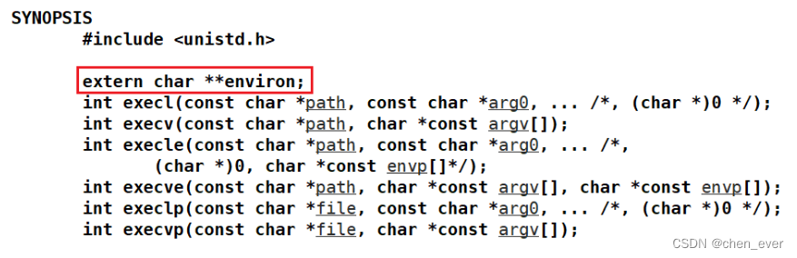 讲到这里,我们的C/C++素养让我们意识到当函数传参数组时,传递的不是数组本身,而是数组首元素地址,所以在 main 函数的形参列表中写成的 char* envp[] 形式,本质上是一个二级指针,名为 environ ,查看一下 man 手册: