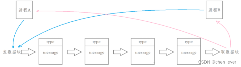 消息队列实际上就是在系统当中创建了一个队列,队列当中的每个成员都是一个数据块,这些数据块都由类型和信息两部分构成,两个互相通信的进程通过某种方式看到同一个消息队列,这两个进程向对方发数据时,都在消息队列的队尾添加数据块,这两个进程获取数据块时,都在消息队列的队头取数据块。