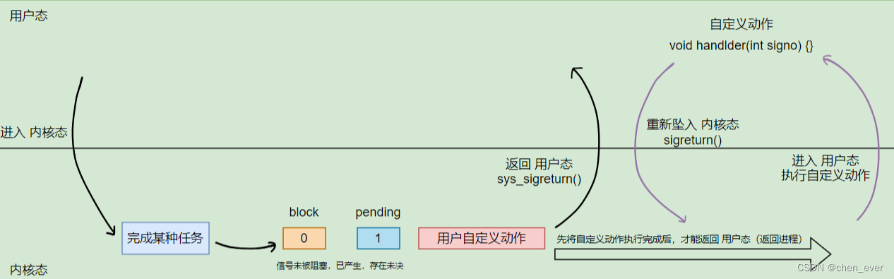 这种情况就比较麻烦了,用户自定义的动作位于 用户态 中,也就是说,需要先切回 用户态,把动作完成了,重新坠入 内核态,最后才能带着进程的上下文相关数据,返回 用户态