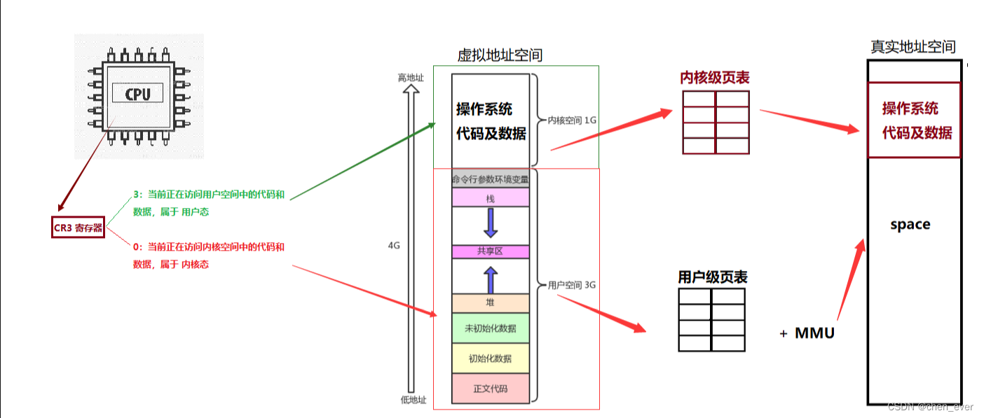 在 CPU 中,存在一个 CR3 寄存器,这个 寄存器 的作用就是用来表征当前处于 用户态 还是 内核态
