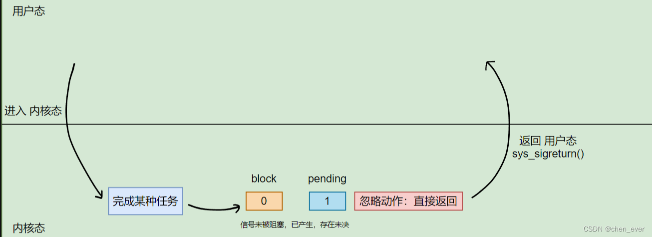 当 内核态 中任务完成,准备返回 用户态 时,检测到信号 递达,并且此时为 用户自定义动作,需要先切入 用户态 ,完成 用户自定义动作 的执行;因为 用户自定义动作 和 待返回的函数 属于不同的 堆栈 空间,它们之间也不存在 调用与被调用 的关系,是两个 独立的执行流,需要先坠入 内核态 (通过 sigreturn() 坠入),再返回 用户态(通过 sys_sigreturn() 返回)