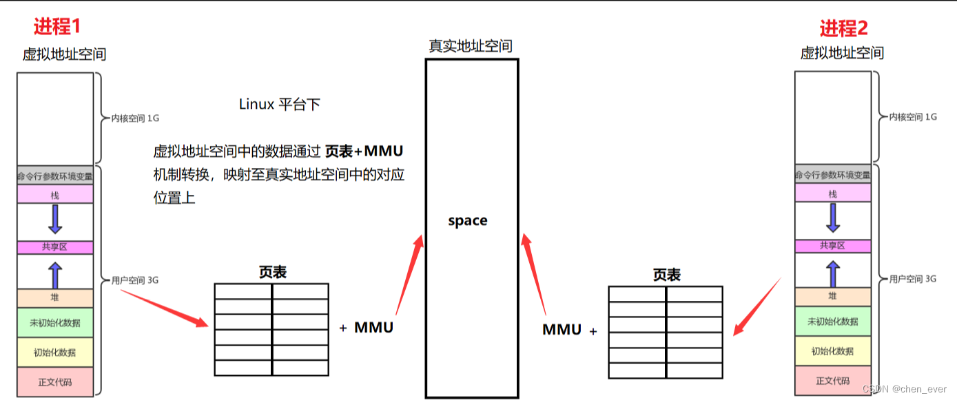 MMU机制 与真实的地址空间建立映射关系 - 每个进程都有自己的 进程地址空间,不同 进程地址空间 中地址可能冲突,但实际上地址是独立的