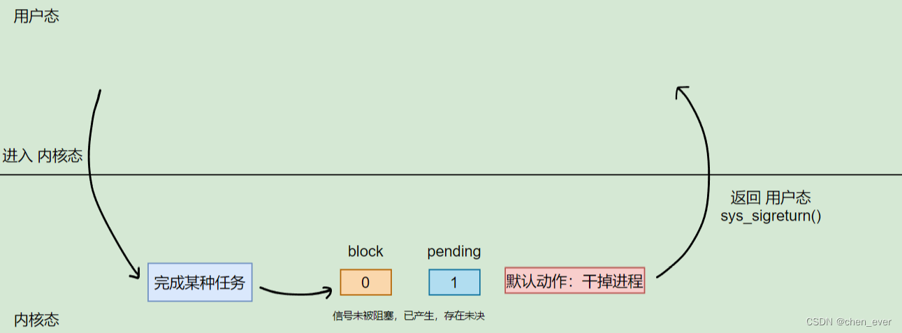 大多数信号的默认执行动作都是 终止 进程,此时只需要把对应的进程干掉,然后切回 用户态 就行了