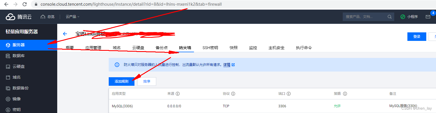 13、腾讯云上开放3306端口(本人使用的是腾讯云轻量应用服务器)