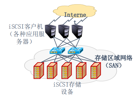 传统方式:应用程序 → SCSI或者光纤驱动 → 主机控制器 → 光纤或者SCSI母线 → Storage存储设备。(传输的长度有限)