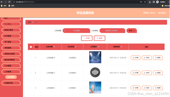 如图5.4显示的就是公告信息管理页面,此页面提供给管理员的功能有:根据公告信息进行新增、修改、查询操作等等。