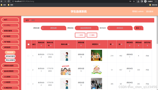 如图5.2显示的就是课程信息管理页面,此页面提供给管理员的功能有:查看已发布的课程信息数据,修改课程信息,课程信息作废,即可删除,还进行了对课程信息名称的模糊查询 课程信息信息的类型查询等等一些条件。