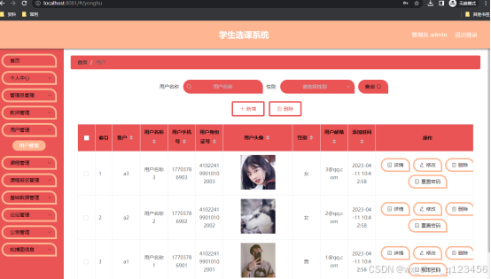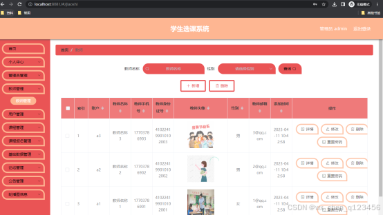 如图5.3显示的就是教师信息管理页面,此页面提供给管理员的功能有:根据教师信息进行条件查询,还可以对教师信息进行新增、修改、查询操作等等。