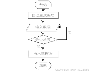程序的添加功能就是提供给操作者录入信息的功能,不管是涉及到用户信息添加,还是其它功能模块涉及到的信息添加,程序的信息添加流程(如图3.3所示)都是一致的。程序都是先对操作者录入的数据进行判定,这个判定规则是一段提前编写完成的程序代码,当程序判定数据符合要求时,才会把操作者录入的数据登记在数据表里面,比如添加的用户信息,就会把新添加的用户信息写入用户信息的数据表文件里面。