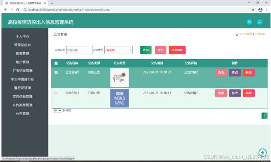如图5.4显示的就是公告信息管理页面,此页面提供给管理员的功能有:根据公告信息进行新增、修改、查询操作等等。