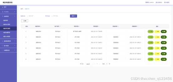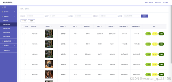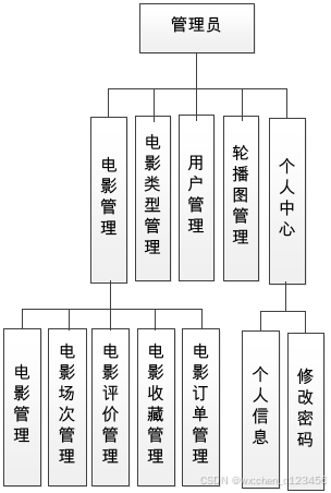 图4.1即为设计的管理员功能结构,管理员权限操作的功能包括管理用户,管理电影类型,管理电影,其中电影管理包括电影场次管理,电影评价管理,电影收藏管理,电影订单管理等子模块。