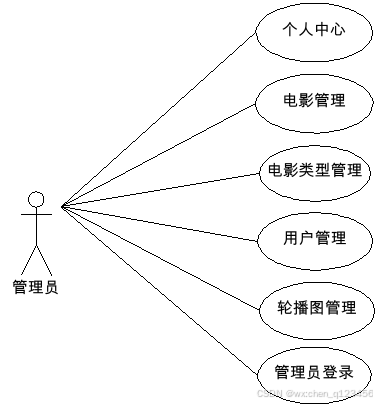 图3.5即为管理员用例图,管理员权限操作的功能包括管理用户,管理电影类型,管理电影,其中电影管理包括电影场次管理,电影评价管理,电影收藏管理,电影订单管理等子模块。