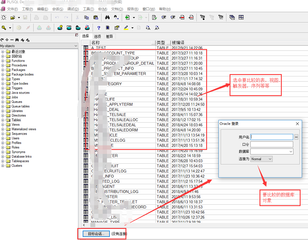 第三步 选中要比较的表,视图,触发器,点击目标会话连接要比较的数据库对象