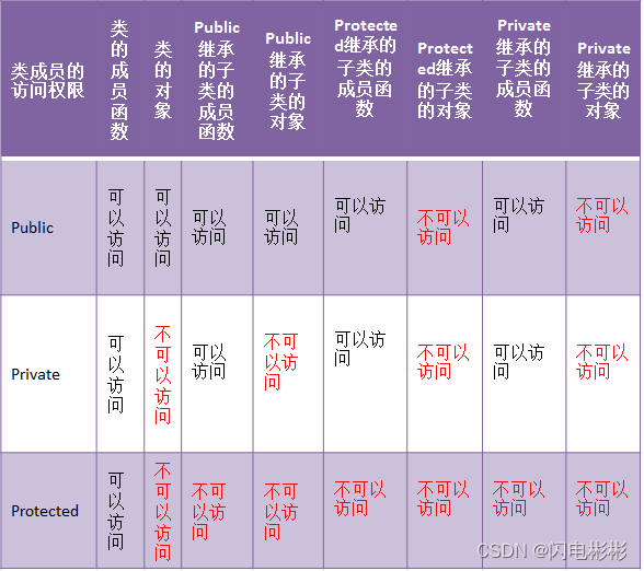 类的成员(包括成员函数和数据成员)都有一个属性,叫做访问权限,有三种: