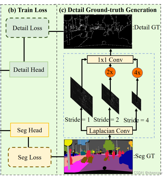 通过detail Aggregation模块从语义分割ground truth中生成binary detail ground-truth,如图5(c)中虚线蓝框所示。这种运算可以通过2-D拉普拉斯核卷积和可训练的 卷积来实现。