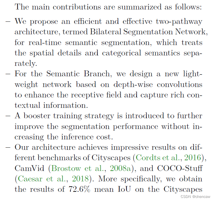 (2)设计了两个特殊的模块,特征融合模块FFM和注意力增强模块ARM,在增加适度开销(运算量)的情况下改进了精度。