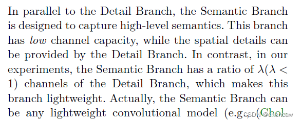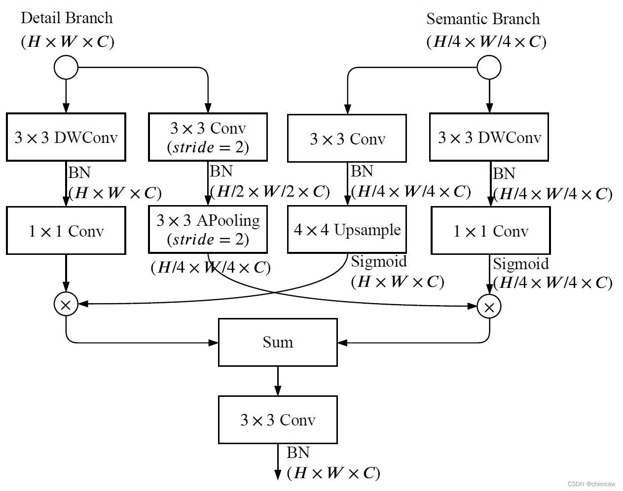 有一些不同的方式来合并两种类型的特征响应,即元素方式的求和和连接。但是,这两个分支的输出具有不同级别的特征表示。细节分支是低级的,而语义分支是高级的。因此,简单的组合忽略了这两类信息的多样性,导致性能下降和难以优化。