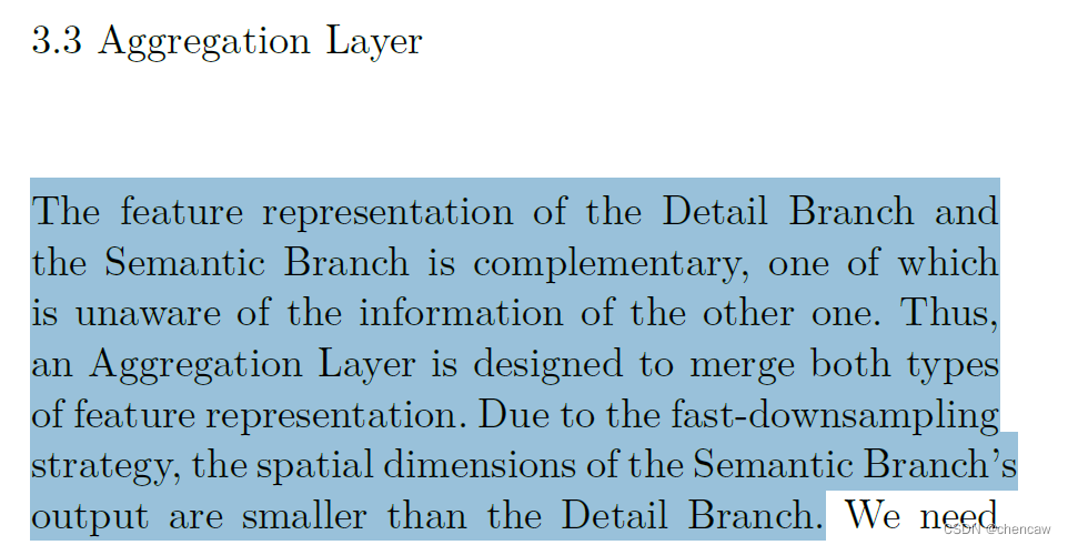 细节分支和语义分支的特征表示是互补的,其中一个不知道另一个的信息。因此,设计了一个聚合层来合并这两种类型的特性表示。由于采用了快速下采样策略,语义分支的输出空间维度比细节分支小,所以需要对语义的输出特征图进行向上采样分支以匹配细节分支的输出。