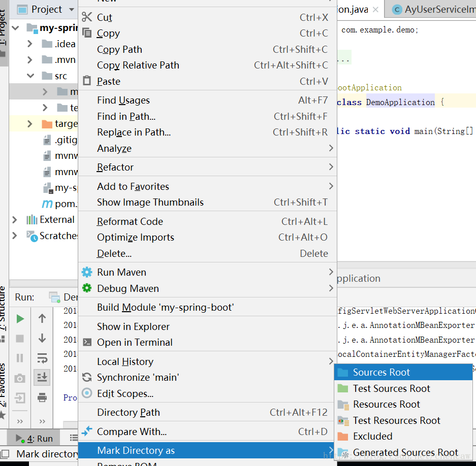 2、在项目src下的main文件夹上右键,选择Mark Directory as ->Source root