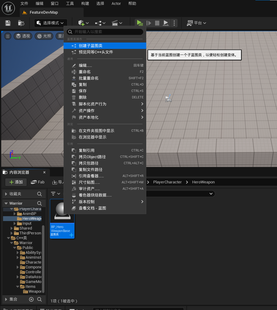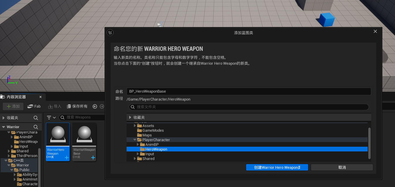 本文介绍了在Unreal Engine中创建武器基类的过程。首先建立C++类WarriorWeaponBase继承自AActor,并在构造函数中禁用Tick。然后扩展基类功能,添加静态网格体(WeaponMesh)作为根组件和碰撞盒(WeaponCollisionBox),设置碰撞盒尺寸为20单位并初始禁用碰撞。最后通过蓝图继承该基类,设置网格体和调整碰撞箱大小完成武器创建。整个实现展示了UE中从C++基类到蓝图子类的武器系统开发流程。