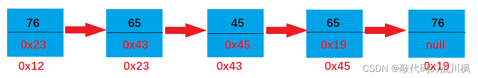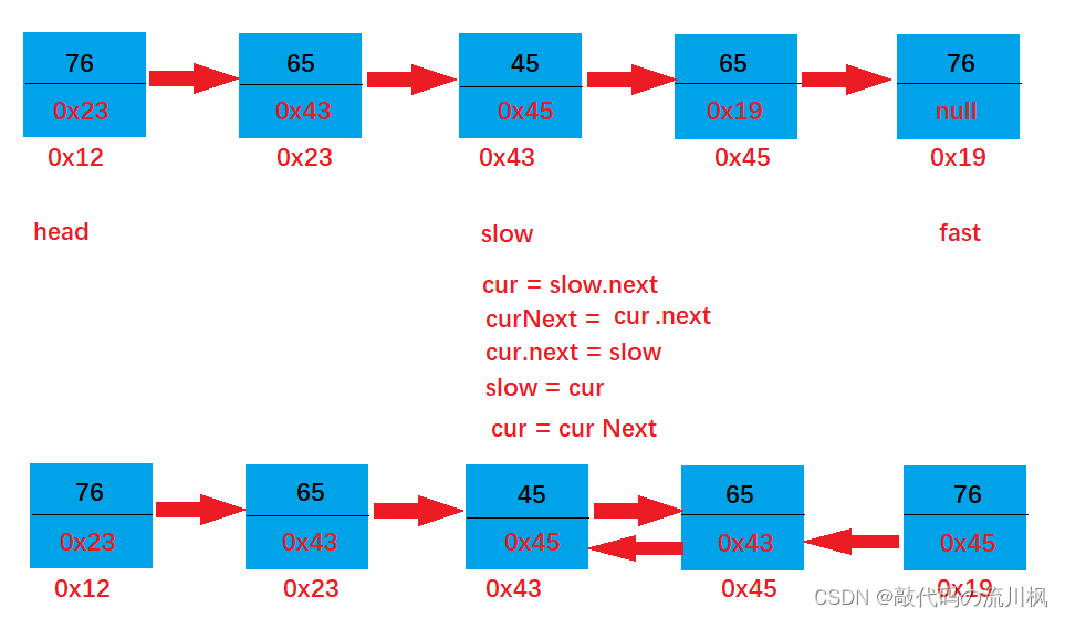 定义一个cur记录待反转链表头节点,curNext记录cur,反转后结果如下: