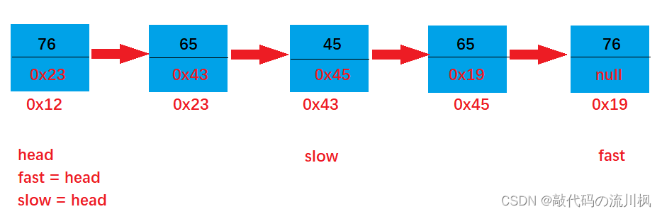 对上面这个链表,我们先定义一个快慢指针,fast和slow,让fast走两步,slow走一步,当fast=null或者fast.next=null时,说明slow为中间节点,如下图;