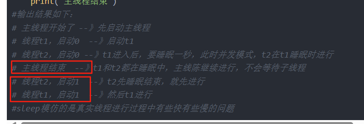 # 主线程结束 --》t1和t2都在睡眠中,主线陈继续进行,不会等待子线程