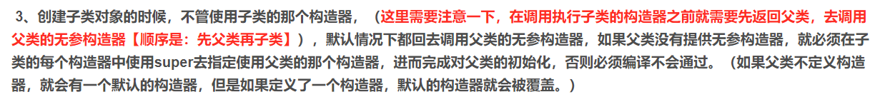 (3)可以调用父类中的所有成员 【需要遵守访问权限】,但不能调用子类的特有成员,其实只能调用子类的重写的方法啦,要是想调用子类的特有方法,还需要向下转型。【父类的引用指向子类的对象,虽然是这样但是你还是不能用特有的方法】
