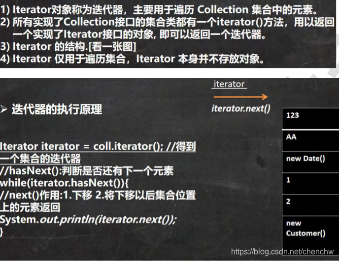Object obj = iterator.next();//作用(1)将指针下移(2)将下移之前的元素返回(3)类型是Object